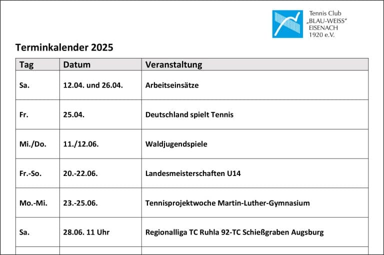 TC Blau-Weiss Eisenach 1920 e.V. Unsere gepflegte Anlage mit 8 turnierfähigen Sandplätzen liegt idyllisch versteckt im Herzen des Eisenacher Johannistales.